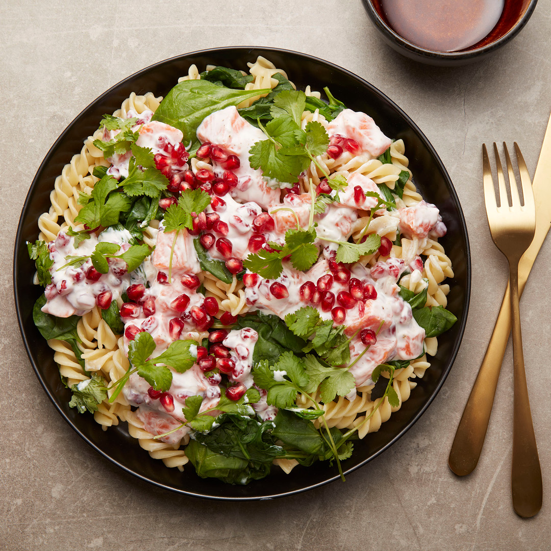 Tilsett gjerne mer grønnsaker etter ønske. I denne retten passer det for eksempel fint å vende inn litt fersk spinat eller servere laksepastaen med litt stekt sopp og løk.